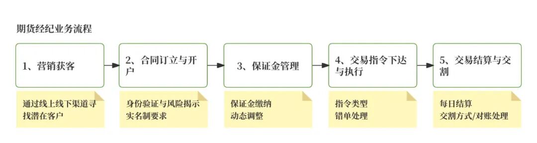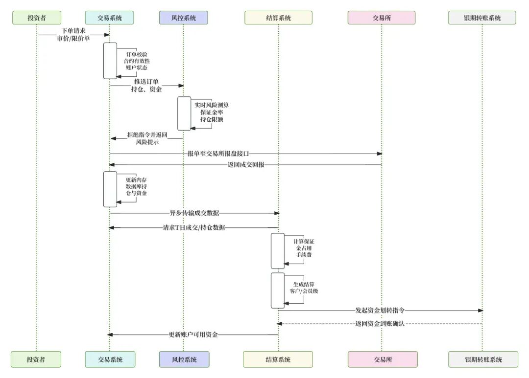 关键步骤:入金 -> 下单 -> 成交回报 ->  结算交割 -> 出金 -> 风险控制;