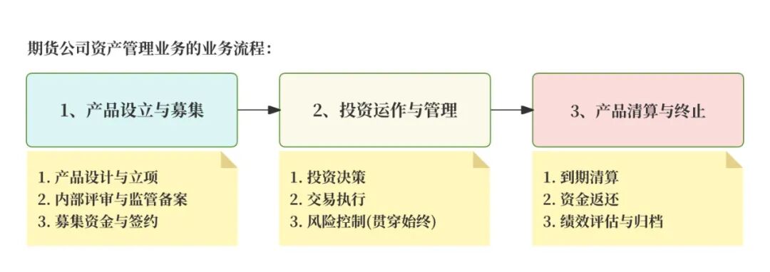 小结:期货公司的资产管理业务,和前面基金公司的本质一样:“受人之托,代人理财”,不再是简单的通道服务,代表客户进行主动的投资管理,其核心业务流程,如下图所示: