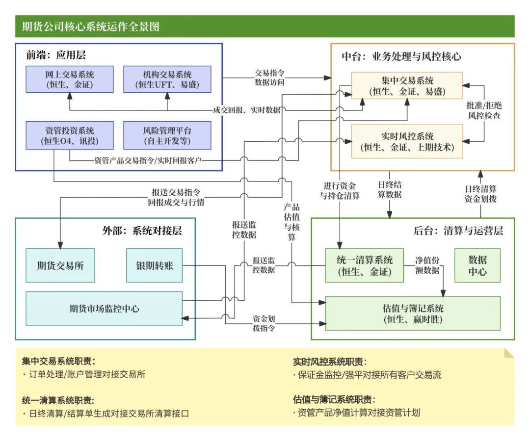 烦请大家先看张:期货公司核心系统运作全景图,从图中可清晰得知各个系统之间脉络、各子系统的作用,期货公司从开户、合约交易、投资决策到风险管控,再到清算交割、报送数据的完整闭环流程,以及各核心系统在其中扮演的角色。