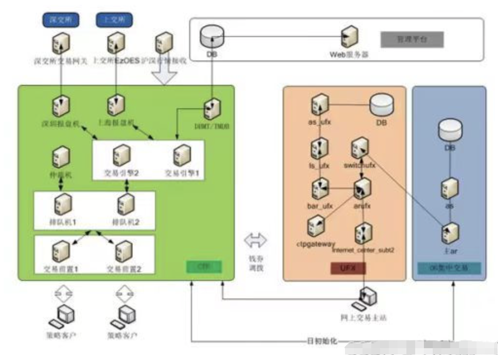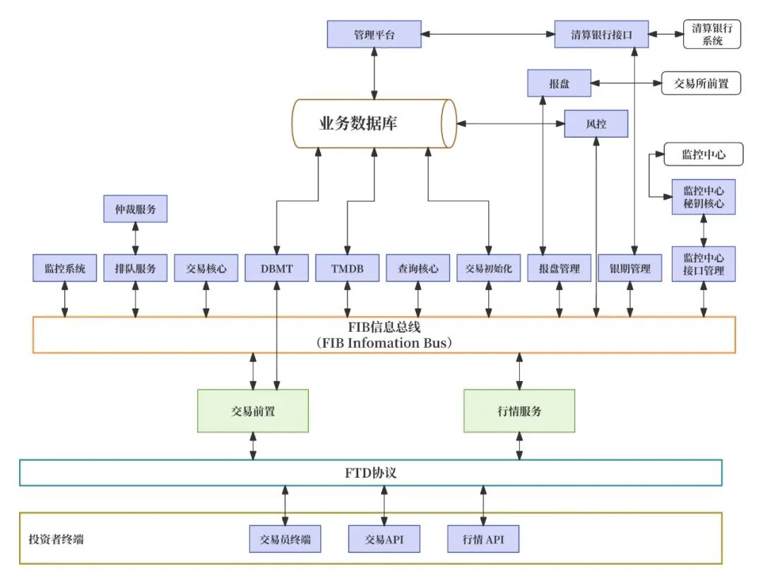 包括:投资者终端、交易员终端、FTD协议、交易前置、行情服务、FIB信息总线、仲裁服务、排队服务、交易核心、交易查询、DBMT、TMDB、交易初始化、报盘管理、报盘、风控系统、业务数据库、管理平台、监控系统、银期管理、清算银行接口(银期接口)、监控中心秘钥接口、监控中心接口管理等,它们之间的关系,如下图所示。