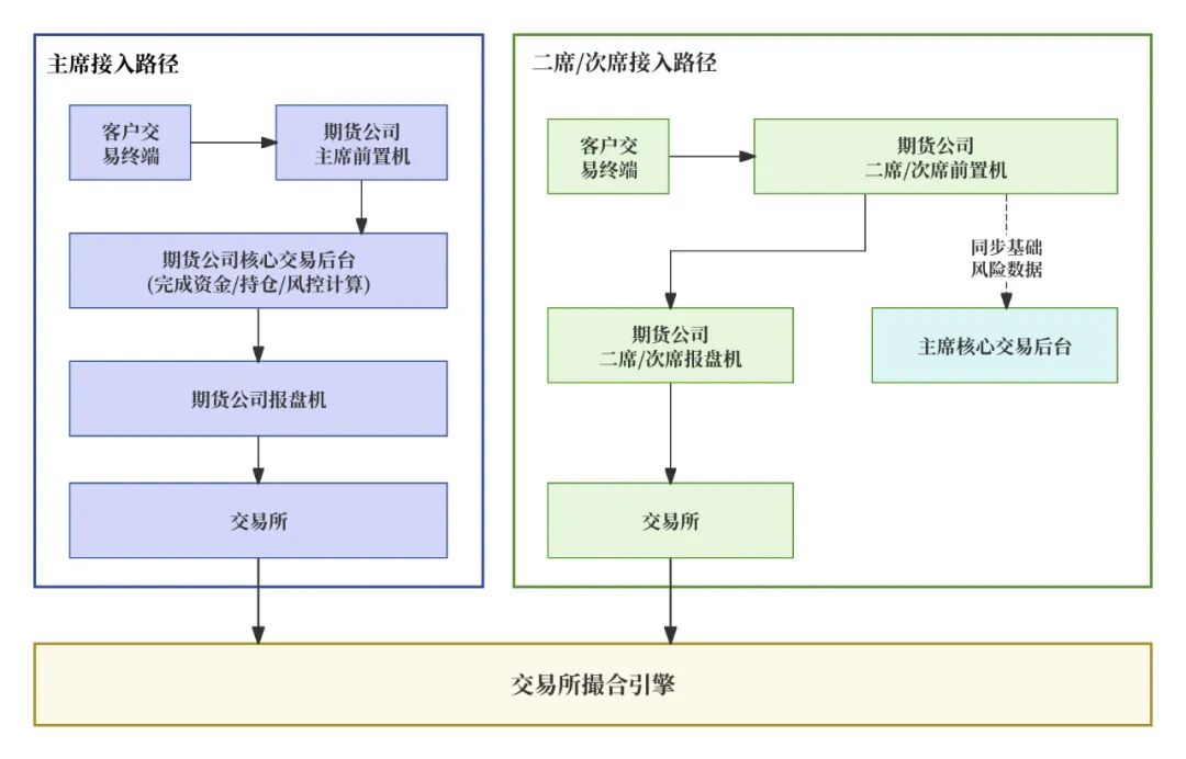 路径:客户 -> 主席前置机 -> 期货公司核心交易后台 -> 主席报盘机 -> 交易所;