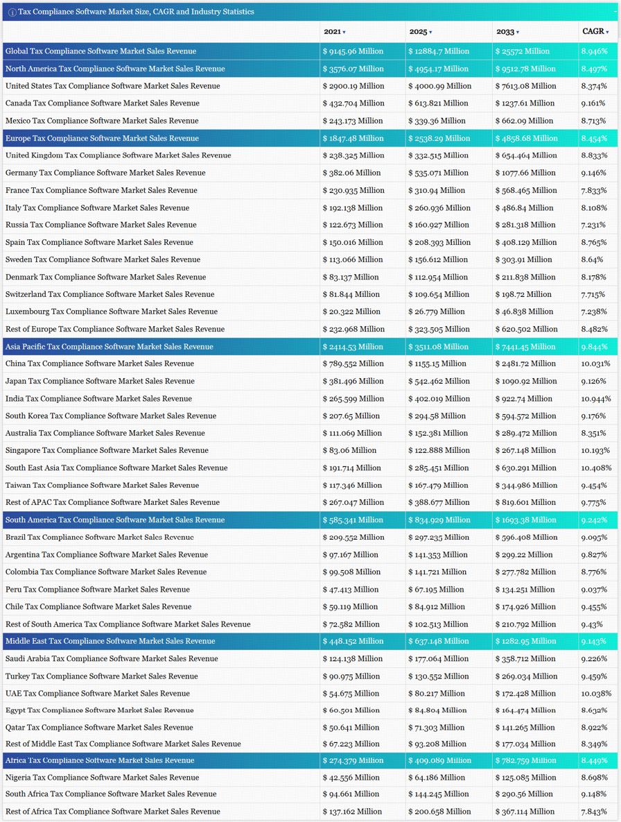全球及各地区、国家税务合规软件市场销售收入在2021、2025、2033年的数据及复合年增长率如下表所示: