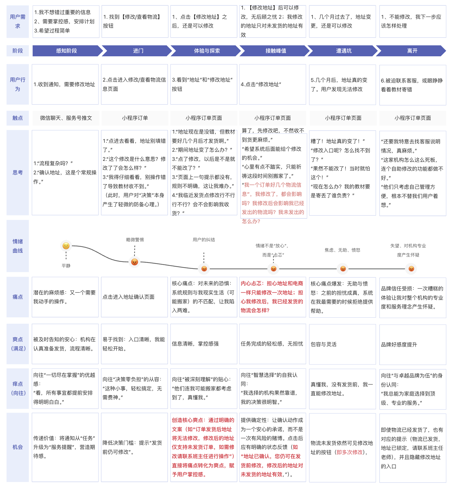 爽点 (创造愉悦): 操作流程非常顺滑,修改地址很快。最关键的是那句提示语——“修改后的地址只对未发货的物流有效”——它给了用户两种强大的感觉:“一切尽在掌握”的掌控感和“系统很灵活”的自由度。