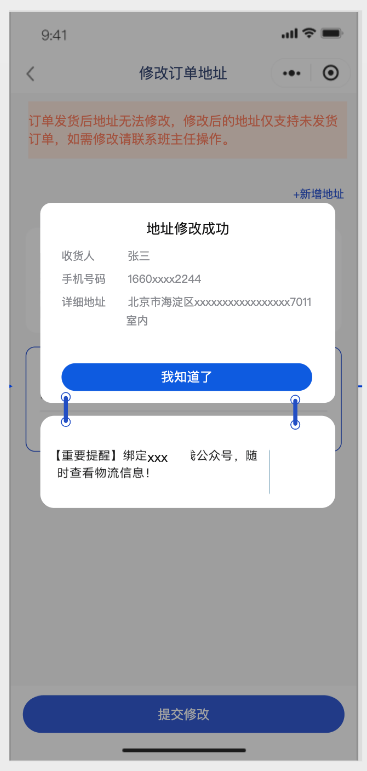 设计:在修改入口明确提示:“在正式发货前,您均可更新地址”。