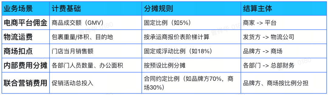 c.分摊逻辑:当一笔总费用需要在多个对象(如多个门店、多个成本中心、多个产品)之间进行分配时,所依据的规则。