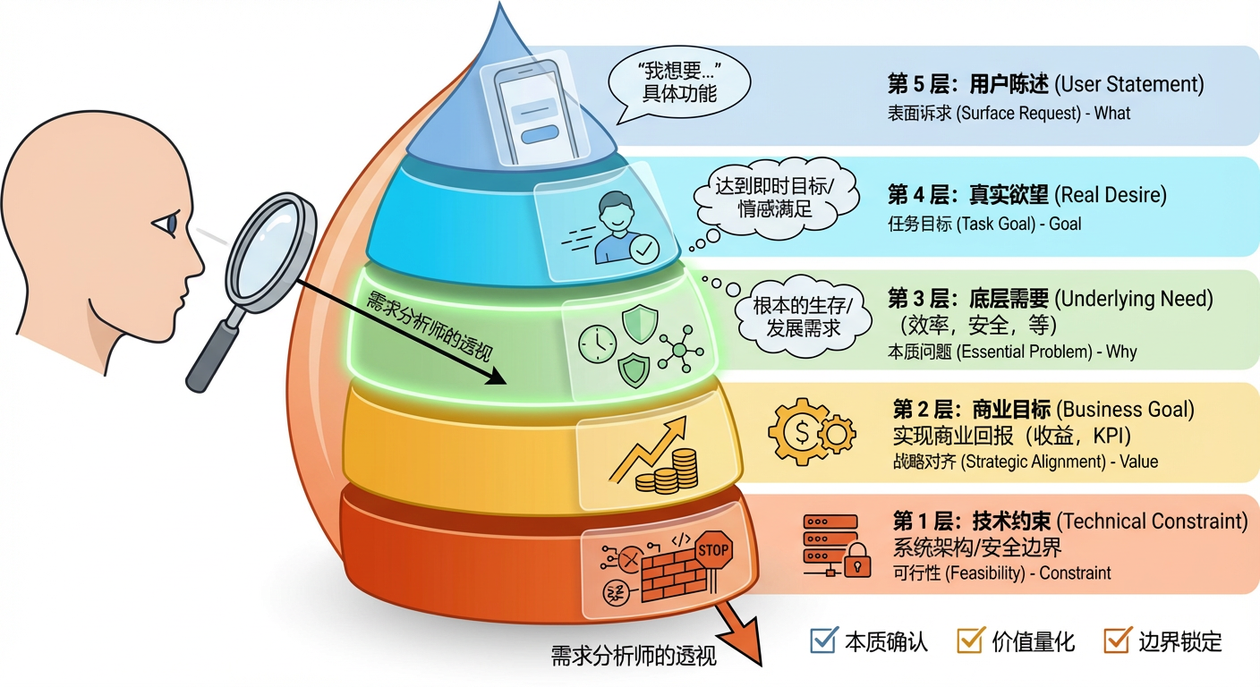 为了解决这个“表象与本质”分离的难题,我们需要一把解剖刀——五层需求模型。它能帮助我们像剥洋葱一样,一层层穿透用户的表象陈述,直达商业和人性的根源。