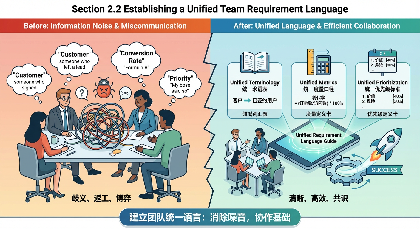 即使你准确捕获了需求的本质价值,如果团队成员对同一个词的理解是南辕北辙的,那么再完美的分析也会在执行中走样。统一需求语言是消除信息噪音、建立高效协作的基础设施。