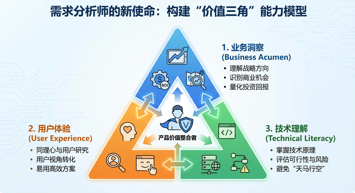 在价值驱动的模式下,只懂画原型、写文档的分析师已经不够用了。我们需要升级自己的能力模型,构建一个稳固的“价值三角”,成为真正的产品价值整合者: