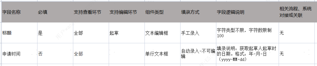 基于业务需求,不是所有的字段都是在各个环节都显示或编辑的,所以需要说明支持查看和编辑的环节。而组件类型有的是单行文本编辑、下拉选项、自定义弹窗等等,而下拉选项则还需要注明单选还是多选。填录方式则有的是需要手工录入,有的则会自动录入,自动录入则需要注明是否支持编辑等。如果该字段与其他流程或外部系统有关联,则也需要注明,因为可能涉及到多方合作。