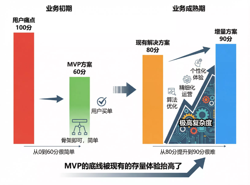 从 0 到 60 分很简单(骨架即可),但从 80 分提升到 90 分,往往需要极高的复杂度(算法优化、精细化运营、个性化体验)。MVP 的底线被现有的存量体验抬高了。