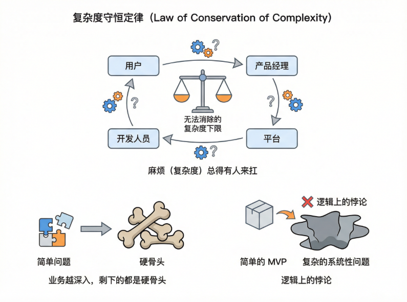 在任何一个系统中,都存在一个无法被消除的复杂度下限。这个复杂度只能在系统的不同参与者(用户、产品经理、开发人员、平台)之间转移,而不能被完全消灭。