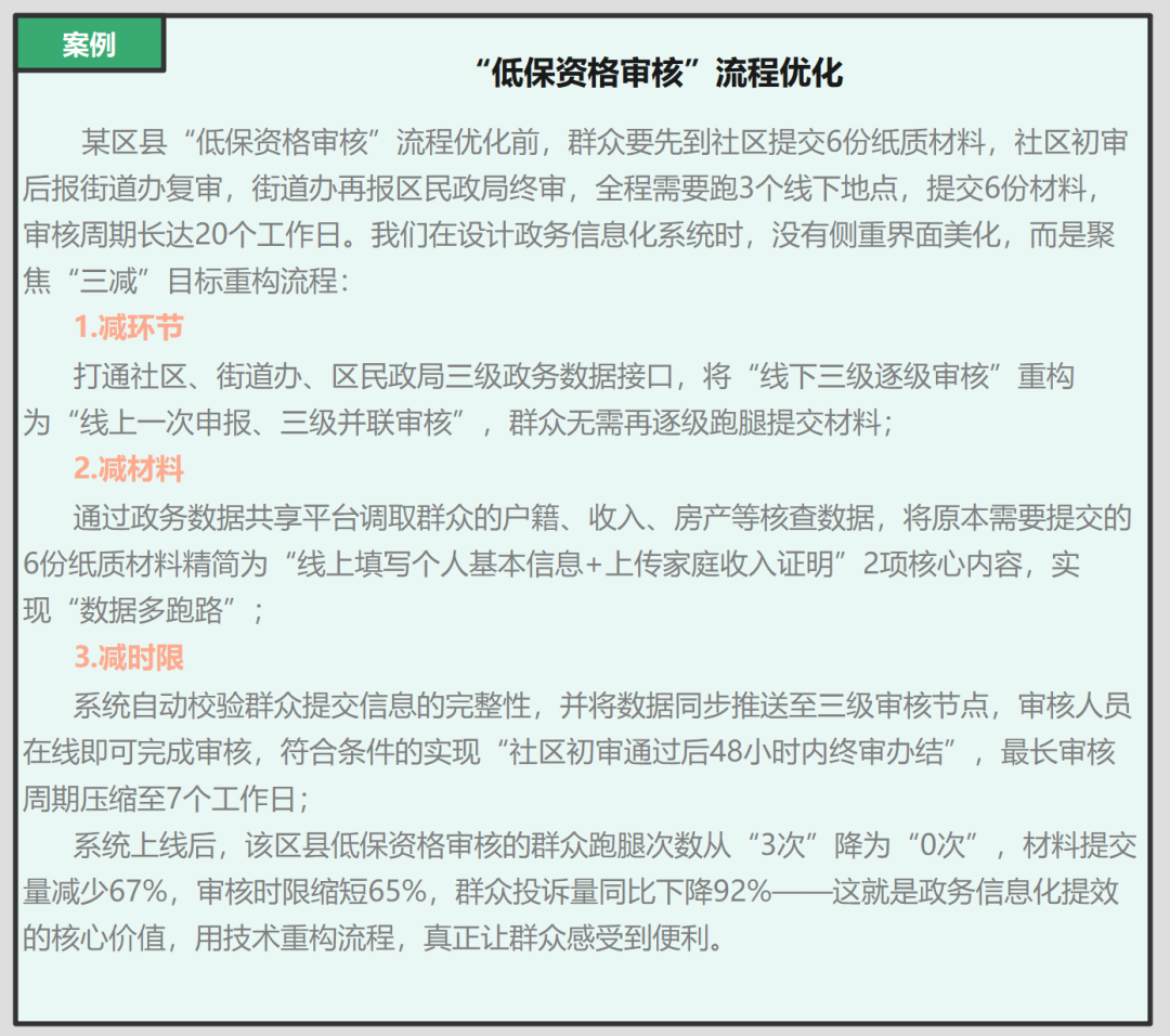 - 减环节:对比传统线下办理流程,检查线上流程是否减少了群众跑腿的环节数量,是否整合了部门间的重复审核环节;