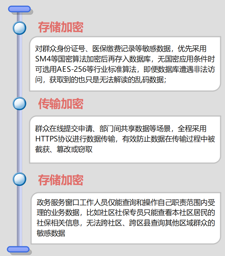 对于非涉密但敏感的政务数据,比如群众的身份证号、医保缴费记录、不动产登记信息等,核心要求是“加密+权限管控”,确保数据在全生命周期内安全可控: