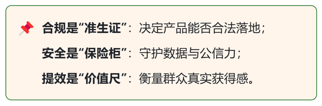 从业多年,我踩过不少坑后深刻明白:成功的政务产品,必须守住“合规、安全、提效”三大生命线。这三者像等边三角形的三条边,缺一条都立不稳。