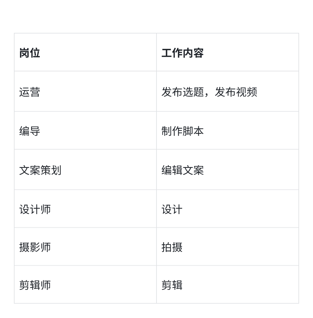 场景:有一个自媒体公司,其中有一个专门负责短视频运营的部门,其岗位和工作内容如下: