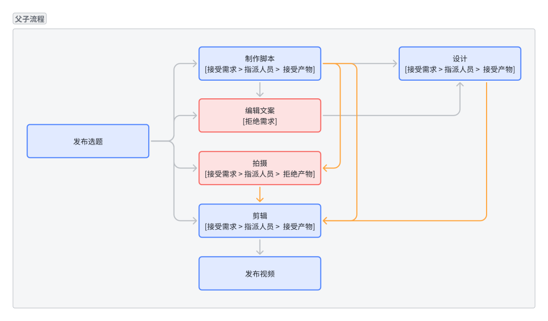当你得意地拿着这个流程给各个岗位分享的时候,设计师刚看完就面露愁容,设计师认为,这样流程的确是足够灵活了,但是如果一个内容需要脚本和文案,但是设计只需要拿到脚本就可以先设计,等到文案做完了,再把文案放到设计图上去就可以,但是目前的流程,得等脚本做完给文案,文案做完给设计才能开展工作,很耽误事。