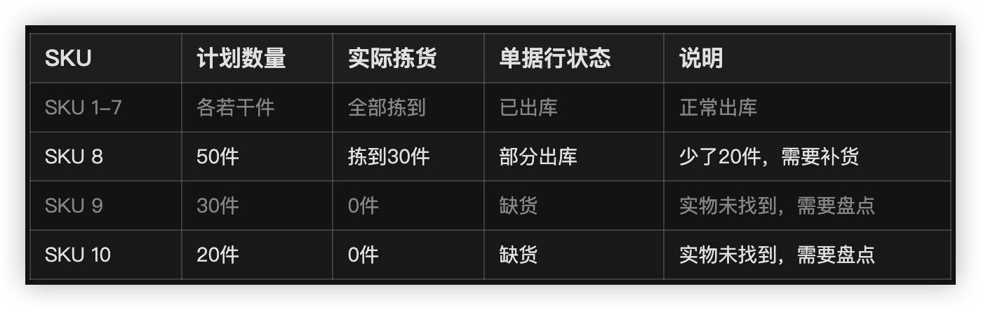 因为WMS的业务特点就是”可能分批拣货、可能部分缺货、可能实物对不上”。如果没有单据行状态,仓库人员和业务部门根本没法知道每个SKU的具体处理情况,也没法决定后续怎么处理。