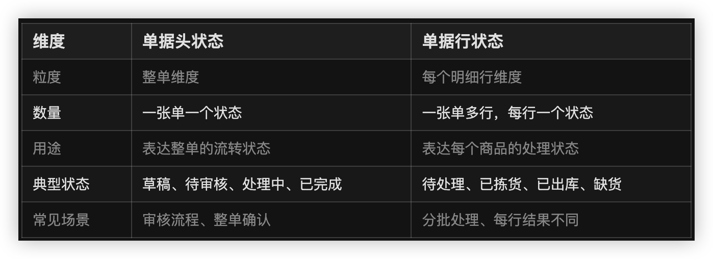 - 单据行状态 → 适合每个明细行的处理情况不同(如供应商分批确认、仓库分批拣货)