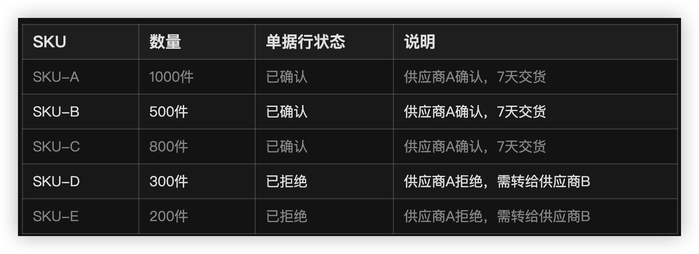 如果只有单据头状态,你可能会设置一个”部分确认”的状态。但这个状态太笼统了,采购员看到”部分确认”,还得点进去看明细,才知道具体是哪些SKU确认了、哪些没确认。而且后续SKU-D和E要转给供应商B,系统怎么知道这两行还需要继续处理?