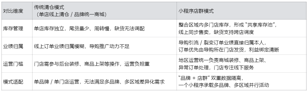 - 资源整合逻辑:以地理区域为单位划分店群,打破单店物理边界,将分散库存、导购资源集中化,解决 “单店清仓规模小、吸引力弱” 的问题;