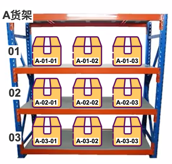 货位:又称库位,是仓库中最小的存货单位,货物一般都是放到货位上存储(例如下图,A-01-01这就是最小的货位)