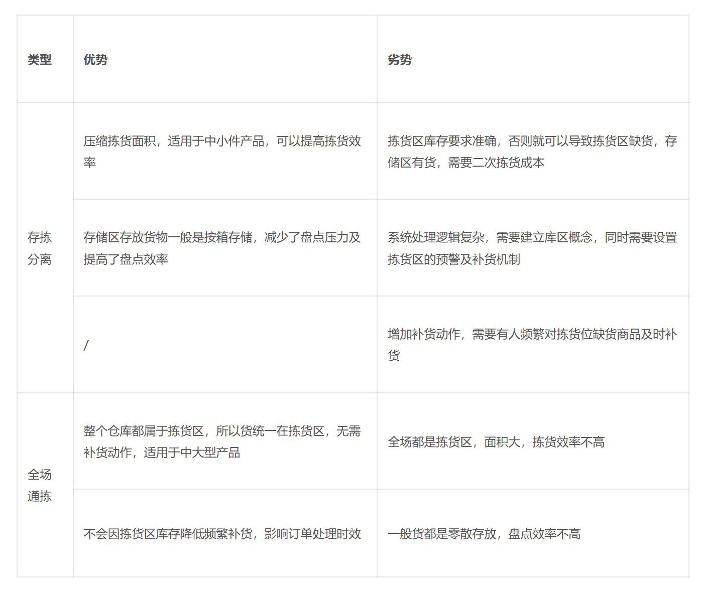 - 全场通拣:整个仓库都是拣货区域,不划分额外的存货区域