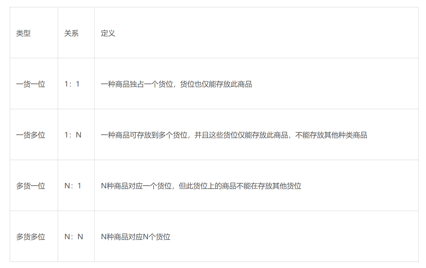 讲背景前先说下货位与商品的关系,然后在说下为什么会做这个需求。其实货位与商品一共分为4种关系,即一货一位、一货多位、多货一位、多货多位4种模式,分别什么意思呢?
