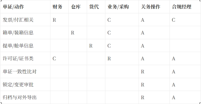 - 审核方:关务操作员(字段一致性与完整性)、合规经理(高风险单证与异常审批)。