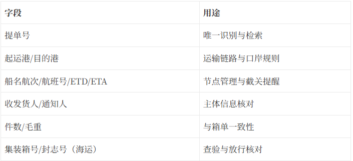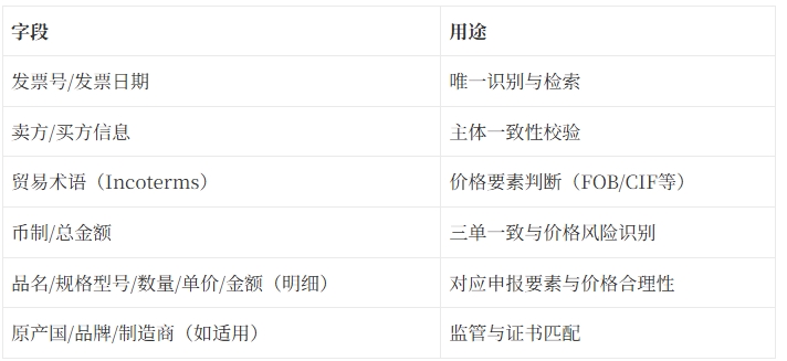 下面这套“最小字段集”用于支撑OCR提取、三单比对、检索与审计。字段越结构化,越能减少人工核对。