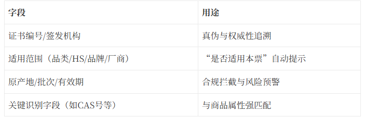 - “证书有,但不知道是否适用本票”:把证书的关键适用范围结构化(品类/厂商/原产地/有效期/批次),并在上传时做匹配提示。