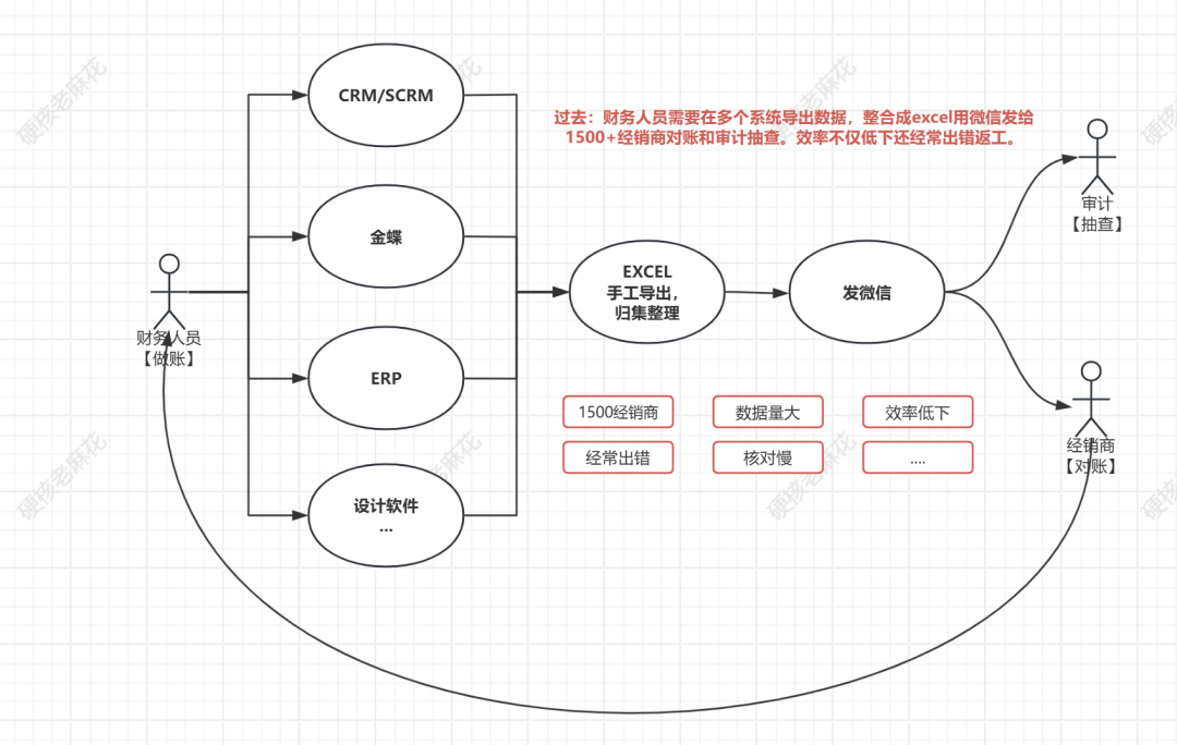 过去,财务人员需要在多个系统导出数据,整合成excel用微信发给1500+经销商对账和审计抽查。效率不仅低下还经常出错返工。