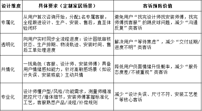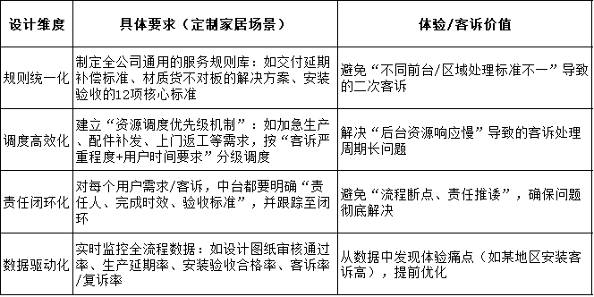 定制家居的客诉80%源于后台能力短板(如设计标准不统一、生产工艺瑕疵、供应链配件缺货、安装交付质量参差不齐、售后服务网络不完善),因此后台设计是“体验保障的根本”。