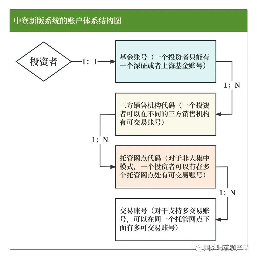 一个投资人一个基金账号同时开设了很多交易账号. 每个交易账号有自己的资金方式, 份额分别托管.(增加银行卡)。