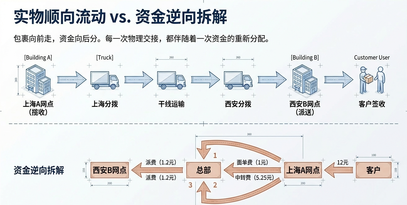 与包裹的实体流转相反,资金的结算流是“逆向”的,并且复杂得多。我们还是以上述包裹为例,假设客户支付了12元快递费给A网点。这12元将如何被拆解和分配?