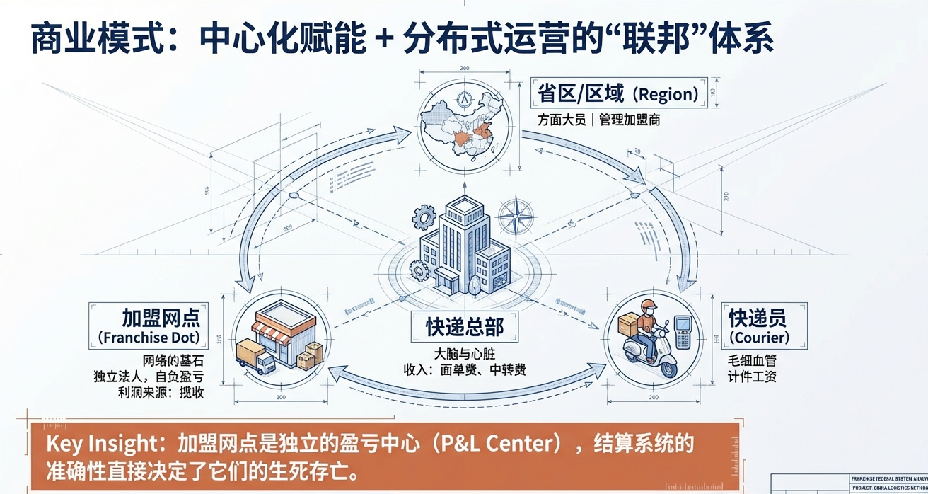 要设计好结算系统,必须先深刻理解其背后的商业模式。加盟制快递网络,本质上是一个“中心化赋能 + 分布式运营”的联邦体系。