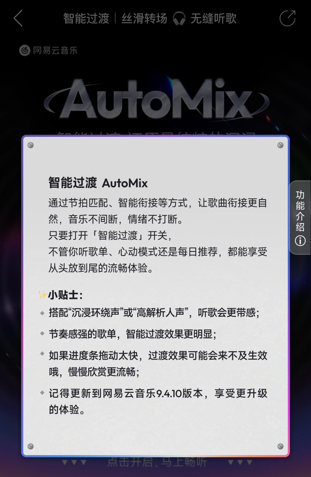 “加法”上,则是始终围绕“听”与“看”进行极致优化,致力于赋予用户主权并延展感官维度。在“听”的维度,通过“智能混音”与“AI调音大师”,将专业的调音权交予用户,定制专属听感。“智能过渡AutoMix”功能,则致力于消除切歌时的短暂空白,实现情绪流的无缝过渡,让听歌体验能更沉浸。