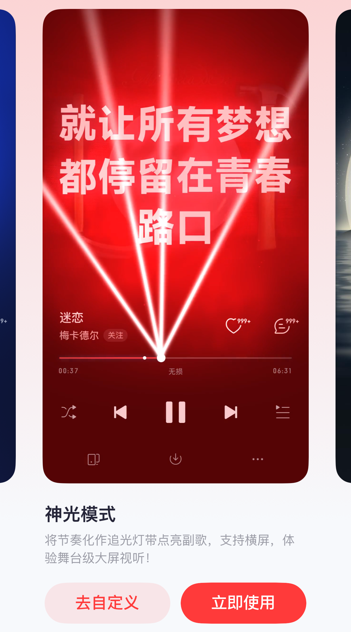 在“看”的维度,则以“DIY播放器背景”等释放品味审美的功能,帮助用户进行个性化表达。加之“神光模式”、“琉璃光波”等播放器视觉特效,让无形的节奏与情绪变得清晰可见,用沉浸式的视听审美全方位助力用户个性表达。