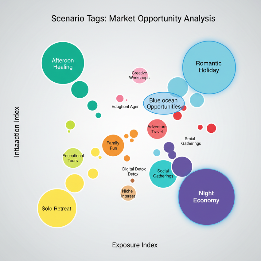 首先是机会发现,当所有场景都被标签化和数据化之后,我们就可以通过数据分析来找到蓝海市场,比如,报告里提到的“场景标签气泡图”,横轴是曝光指数,纵轴是互动指数,气泡大小是市场规模,我们就能很直观地看到,哪些场景是高曝光、高互动、但竞争还不激烈的“蓝海”,比如“浪漫节日”这个场景,可能就比已经杀成红海的“日常通勤”场景更有机会
