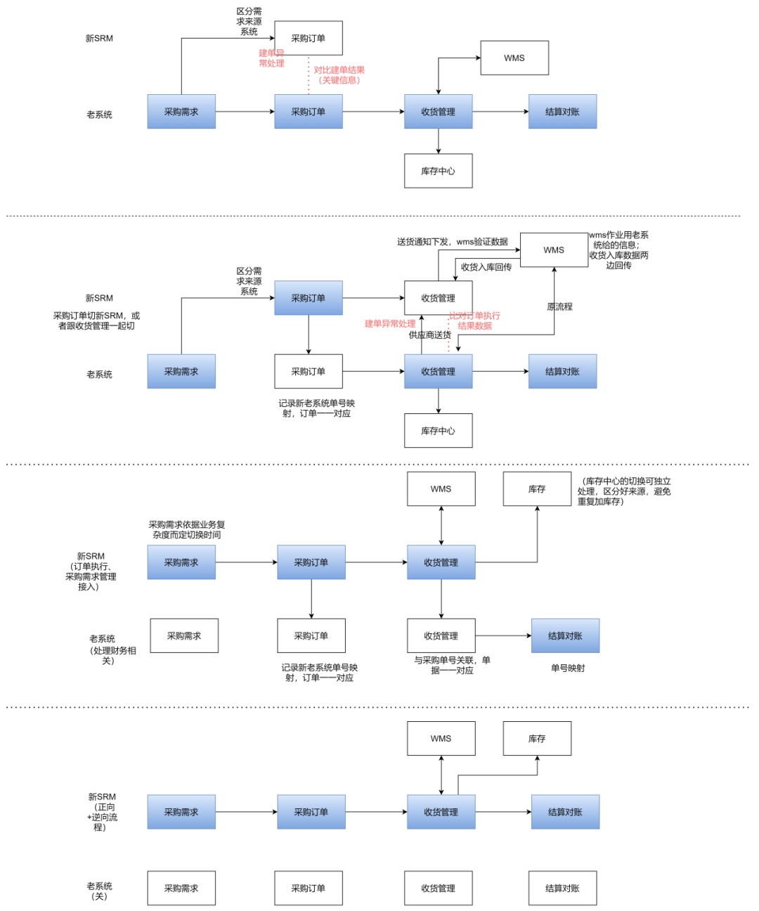 - 根据流程的先后,像结算对账常在月底,需要前置采购订单流程跑通后才到财务这块,所以先在老系统处理,也就是说,有一段过渡期,需要新SRM生成的订单回传老系统,在老系统做结算对账。