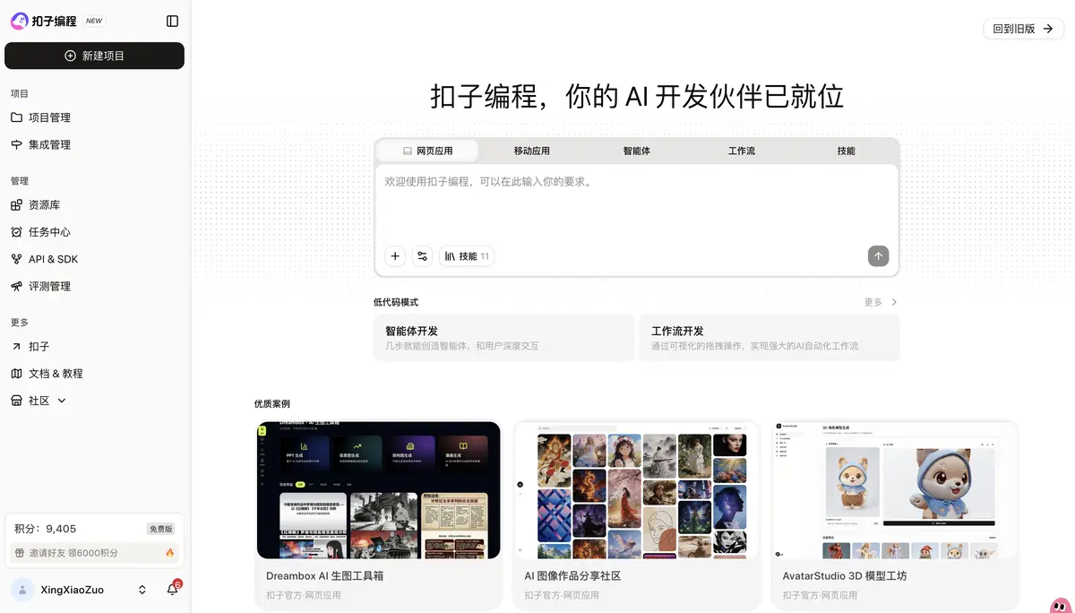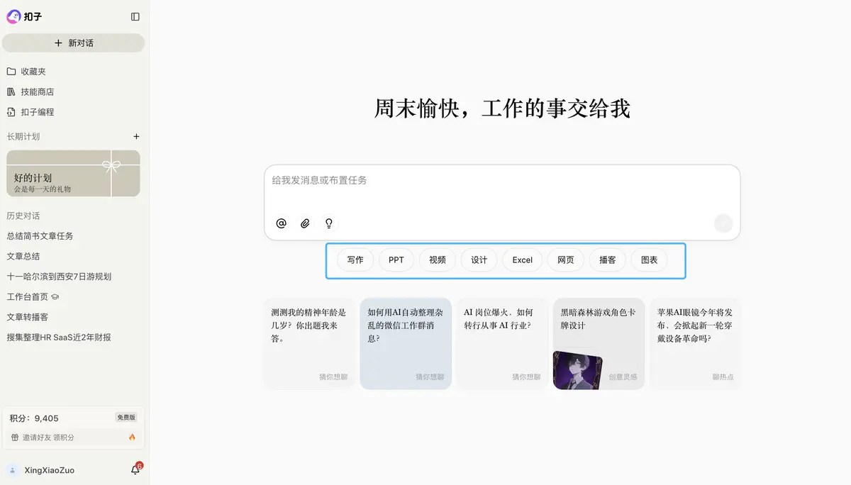 阶段2的扣子: 变成了“瑞士军刀”。你打开它,只有一个对话框。你说:“帮我把这份数据做成PPT,再配个英文解说稿。”它自己在后台先后调用了“数据分析助理”和“PPT生成助理”,最后只给你一个结果。甚至进化到“扣子编程”,你用自然语言说“帮我写个爬虫抓取新闻”,它直接生成代码并运行。