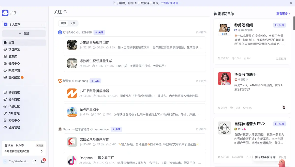 阶段1的扣子: 是一个助理市集。你想做个“周报生成器”,你得自己去创建一个智能体,调好参数,发布出去。每个智能体都是一个独立的孤岛。
