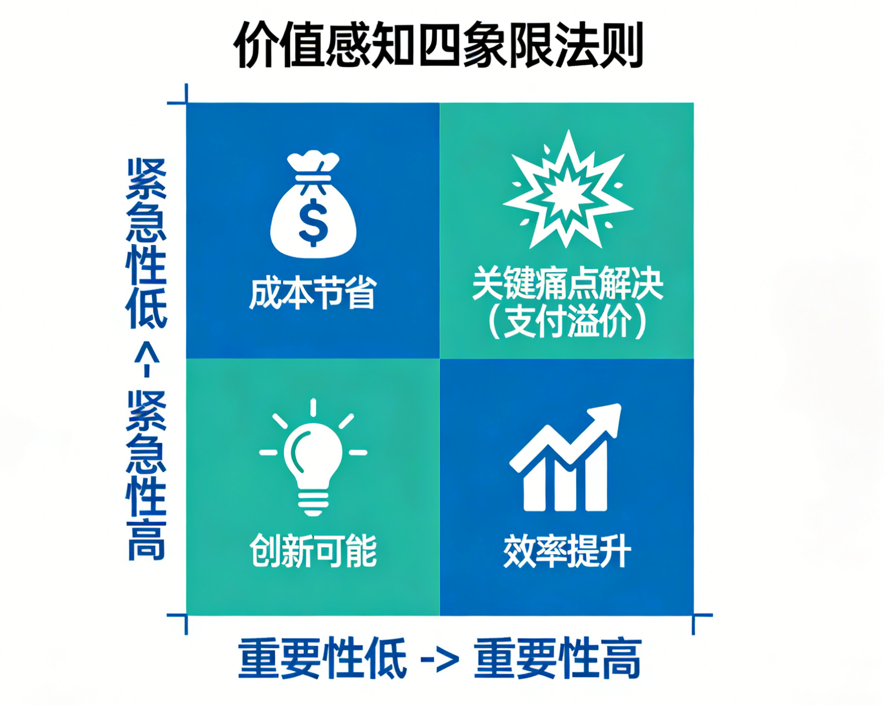 底层逻辑:B端客户对产品价值的感知并非均匀分布,而是存在明确的优先级排序,核心遵循“关键痛点解决>效率提升>成本节省>创新可能”的价值感知逻辑,不同价值象限直接决定客户的付费意愿与溢价接受程度。
