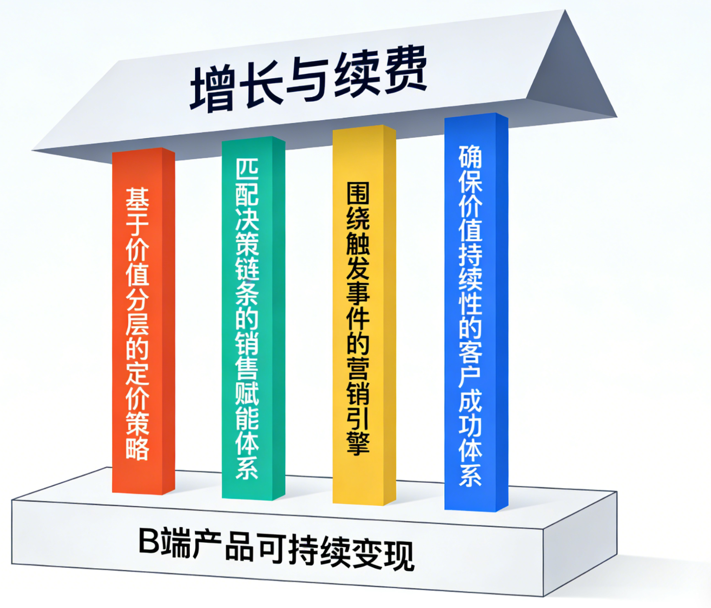 以六大核心采购密码为底层逻辑,可搭建起稳固、可持续的B端产品变现模型,该模型由四大核心支柱构成,各支柱相互支撑、协同发力,共同推动产品变现的长效增长。