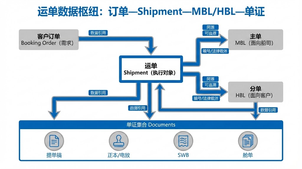 运单是执行对象,MBL/HBL是运单在不同主体下的编号与法律载体;单证模块负责把运单数据输出成可交付文件(提单稿、正本、SWB等)。
