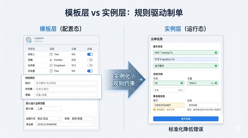 - 模板层:不同运输方式、不同承运商、不同航线对应不同字段集合、校验规则与默认值。