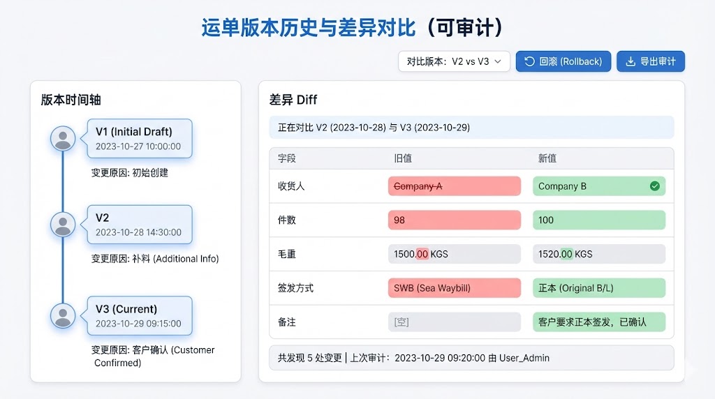 - 差异联动:单证模块提示提单稿需重新生成;费用模块提示可能影响目的港费用条款;客户门户推送“信息已更新待确认”。