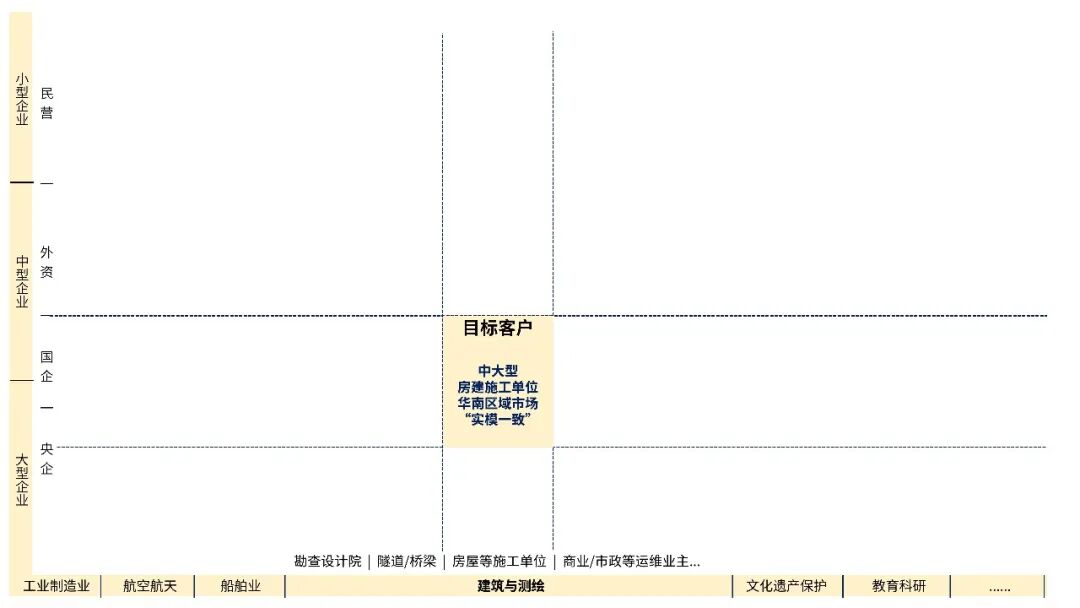 举个例子,某手持三维扫描硬件产品,单纯从市场需求来看,许多行业客户都有机会花钱购买,如工业制造业、航空航天、船舶业、建筑与测绘、文化遗产保护、艺术数字资产、教育科研等。并且每一类行业都可以再次进行细分,如建筑与测绘可以细分成勘查设计院、隧道/桥梁/房屋等施工单位、商业/市政等运维业主等,于是我们依照此分类建立横轴。结合以上客户来看,规模可能从小型企业到大型企业都有分布,并且类型有政府单位、央国企、民营、外资等多种属性,依据此分类建立纵轴。