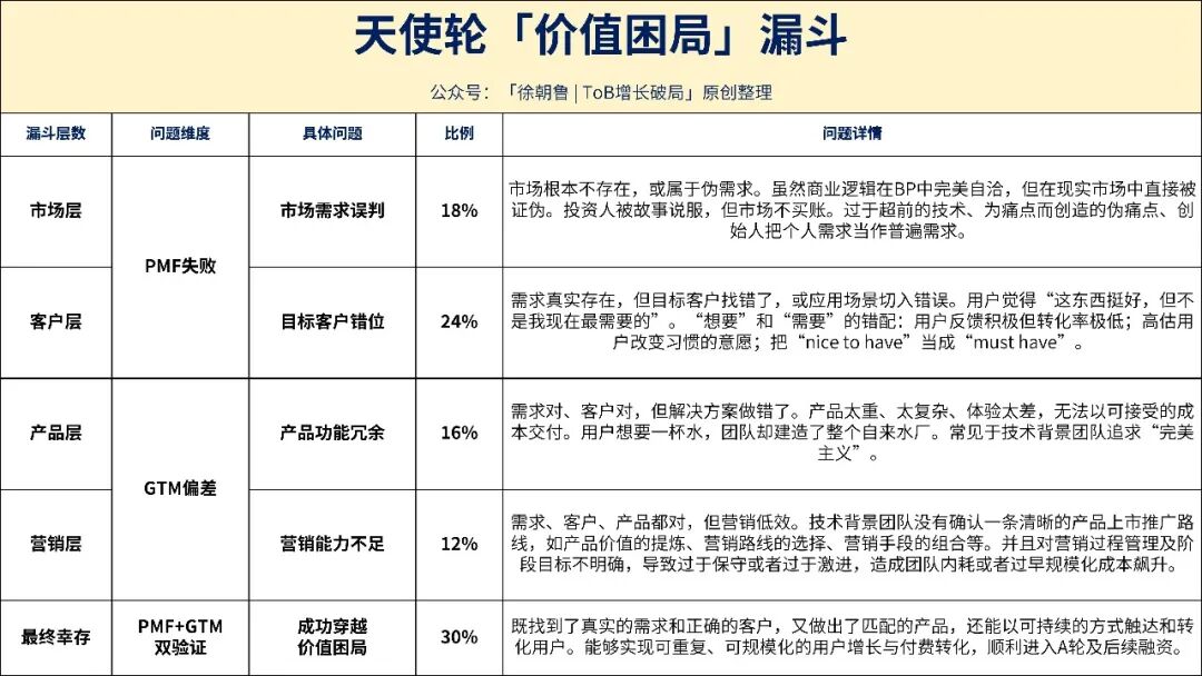 而经过我进一步结合科技企业融资情况和经营数据进行分析后,以上四种情况所占比例分别为:18%、24%、16%、12%,也就是整体约为70%。而剩下的30%企业,则成功穿越价值困局,既找到了真实的需求和正确的客户,又做出了匹配的产品,还能以可持续的方式触达和转化用户。能够实现可重复、可规模化的用户增长与付费转化,顺利进入A轮及后续融资。