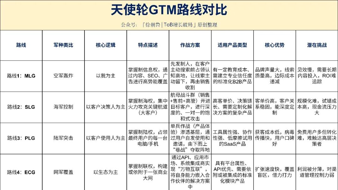 所以我们发现,GTM真正的难点不是不知道方法,而是在一堆方法中能够找出最适合自己的组合,以低成本投入拿到可观的结果,也就是找到属于自己产品的那条独有的路线。我要再次强调,天使轮产品GTM是“线”,而非“点”,亦非“面”。有些企业做成了“点”,比如搞一次发布会、发一篇公众号就以为产品发布了,这是自欺欺人。有些企业做成了“面”,铺天盖地的广告,无差别的客户骚扰,生怕别人不知道自己的产品,这是无的放矢。唯独以“线”的方式制定、跟踪计划才有实战价值。通常来说,天使轮产品GTM有以下几条路线:
