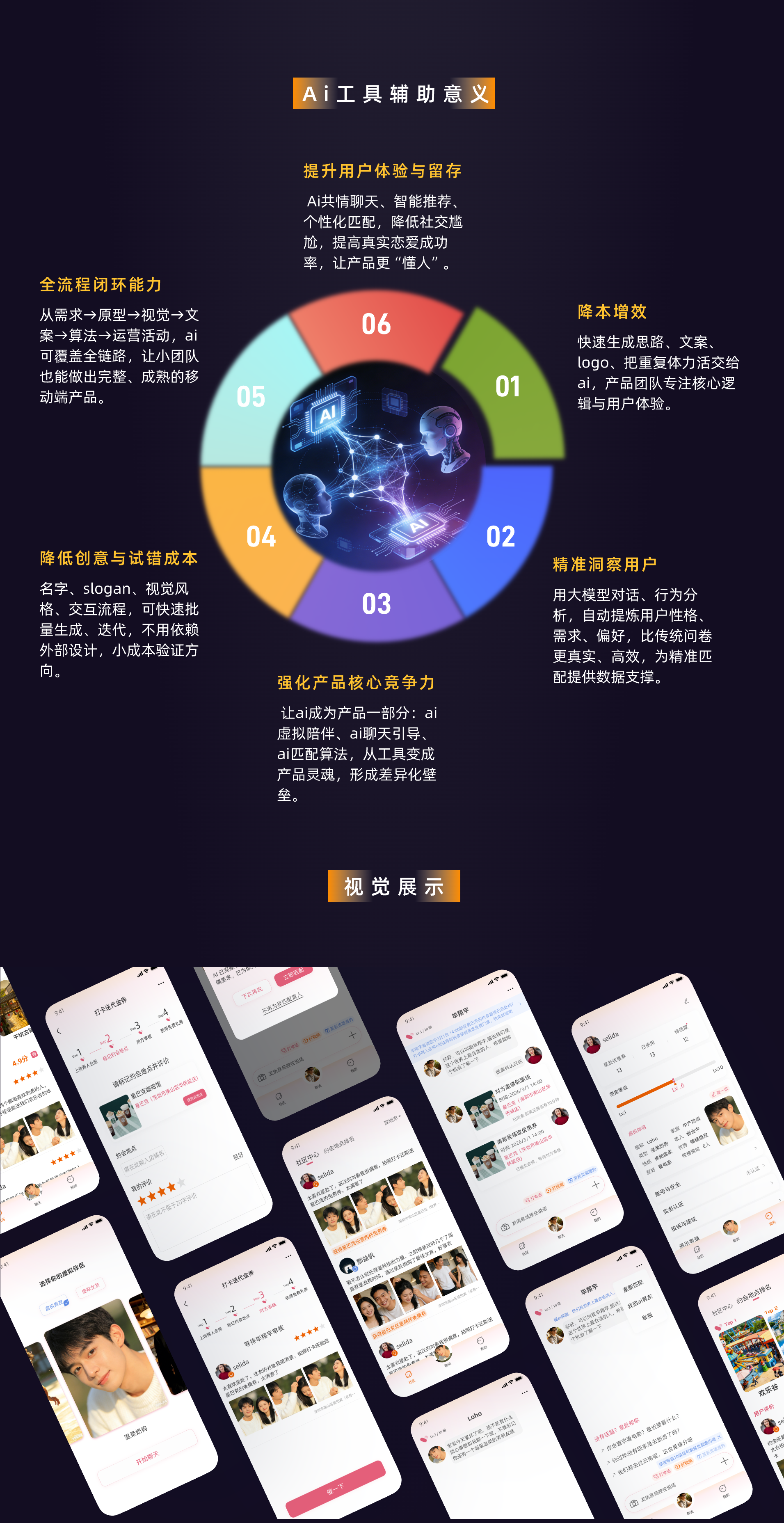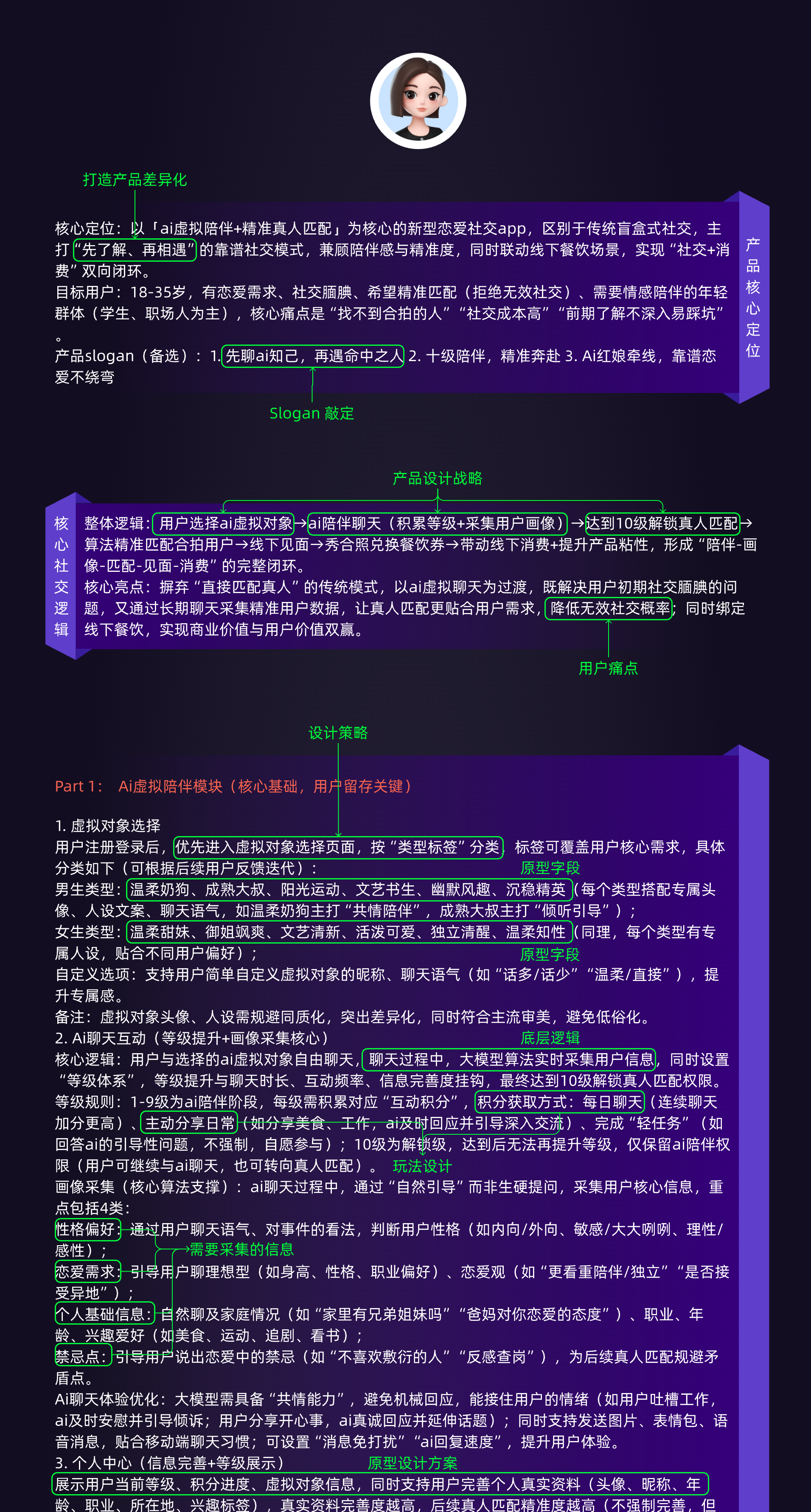 问题1:懂你的AI为什么要匹配真人。对于产品定位:一款靠谱红姑娘,使用的用户都是奔着谈恋爱与结婚去的,而你无法和AI组成一个家庭,这就是真人的意义。问题2:频繁的AI对话要比Soul那种一次性和若干人聊天来的更加高效,我们通过AI来了解用户心理状态提供情绪价值,而像通关一样得到一个合适的男票就是高效匹配的价值